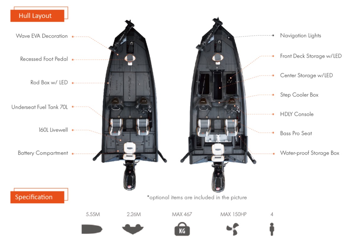 - Modelové řady Kimple Bass Boat HA-K-V : lze objednat ve verzi s palubou krytou kobercem (řeší se individuálně se zákazníkem).
