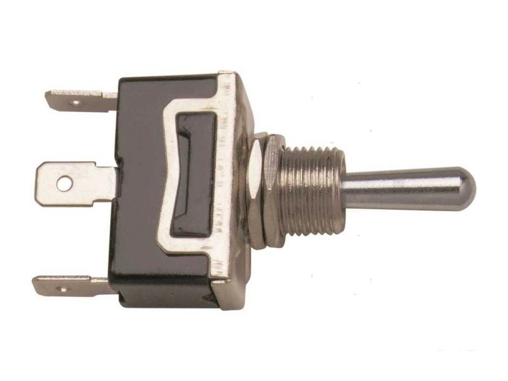 Páčkový spínač s tělem z kompozitu a mosaznou pákou.